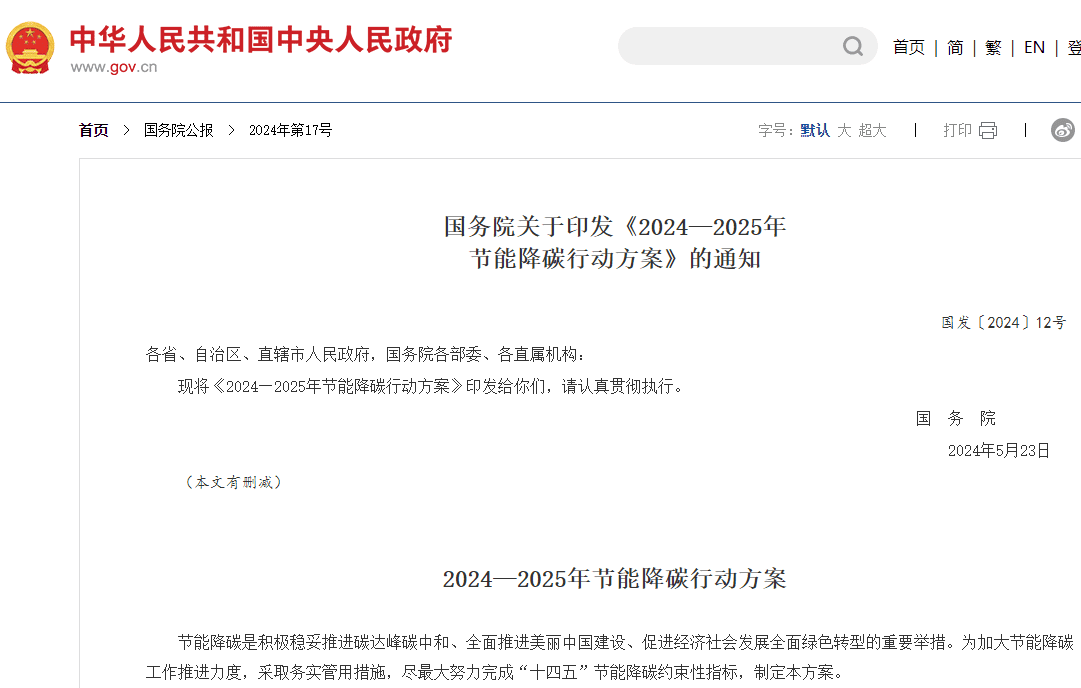 5月,國務院印發了關于《2024—2025年節能降碳行動方案》的通知,通知中指出,要分領域分行業實施節能降碳專項行動,更高水平更高質量做好節能降碳工作,為實現碳達峰碳中和目標奠定堅實基礎。