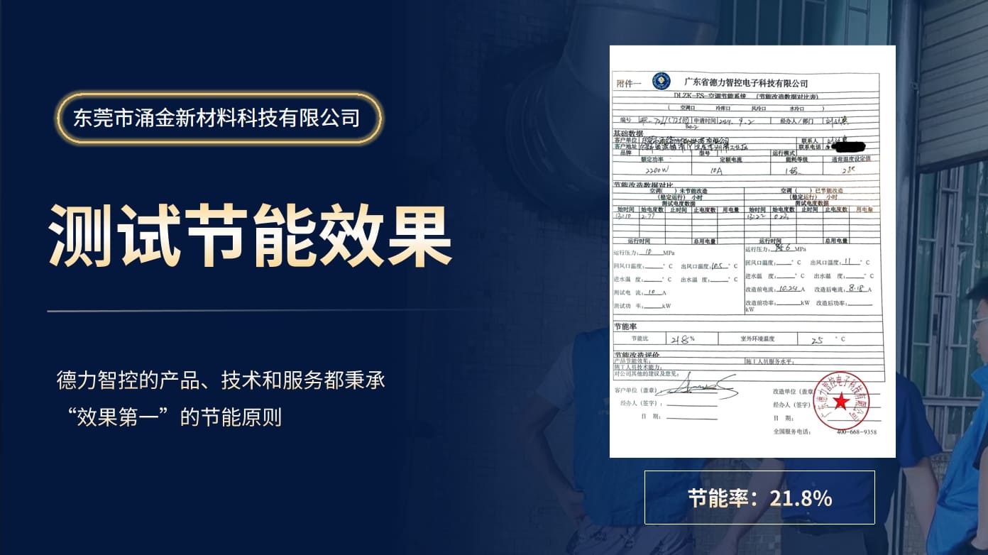 出于節能減排及節約成本等方面的考慮,東莞涌金新材料公司引入了德力智控節能方案。經過雙方專業人員現場測算,空調系統節能率21.8%,這意味著在德力智控正式節能改造下,該企業能在空調用電方面節省一筆不小的資金。