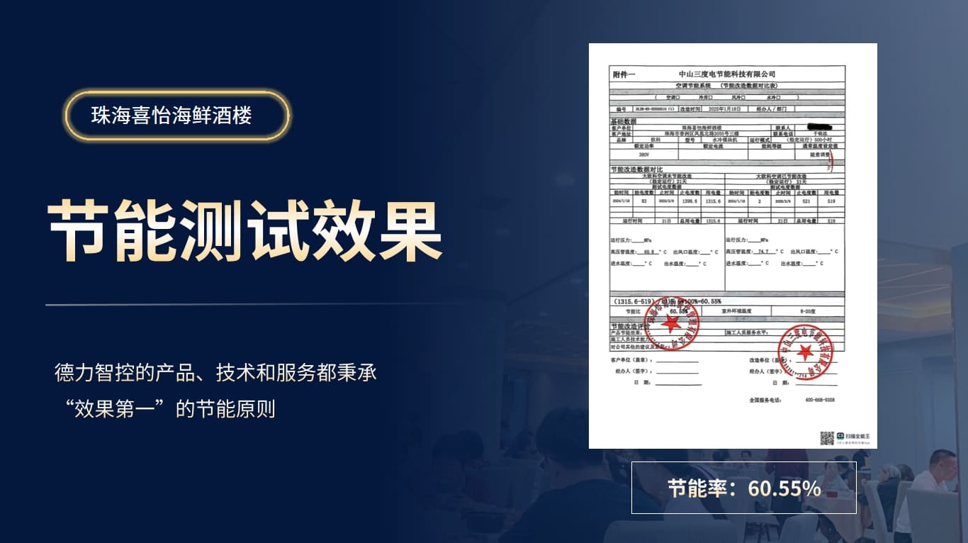 以珠海市一特色海鮮酒樓為例,德力智控為其量身定制節(jié)能改造方案,實(shí)地測(cè)試21天,節(jié)能率高達(dá)60.55%!
