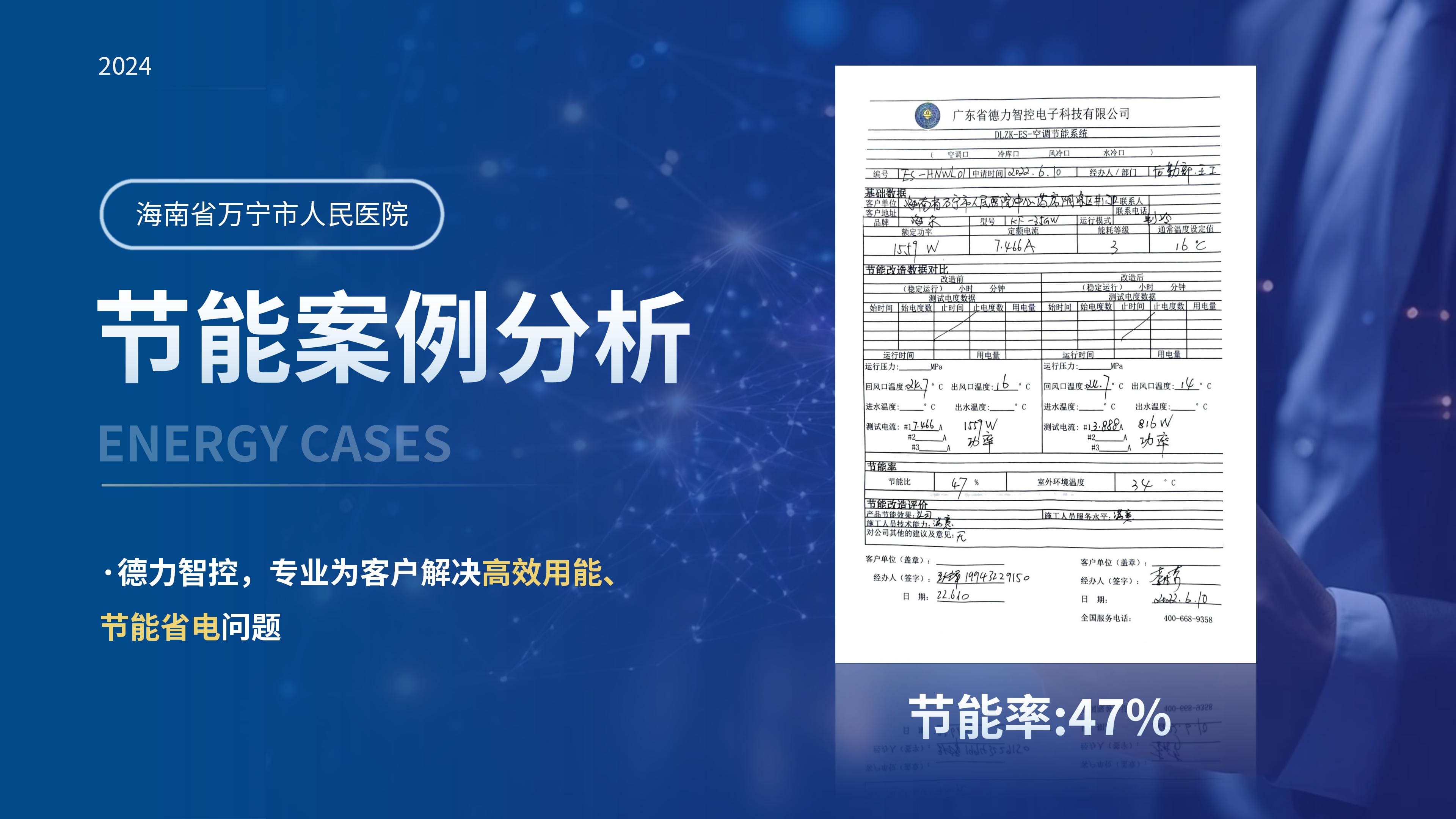 就拿三級綜合醫(yī)院為例,德力智控為海南省萬寧市人民醫(yī)院的制冷(空調(diào))系統(tǒng)節(jié)能改造,節(jié)能率更是高達(dá)47%,獲得了院方的一致好評!