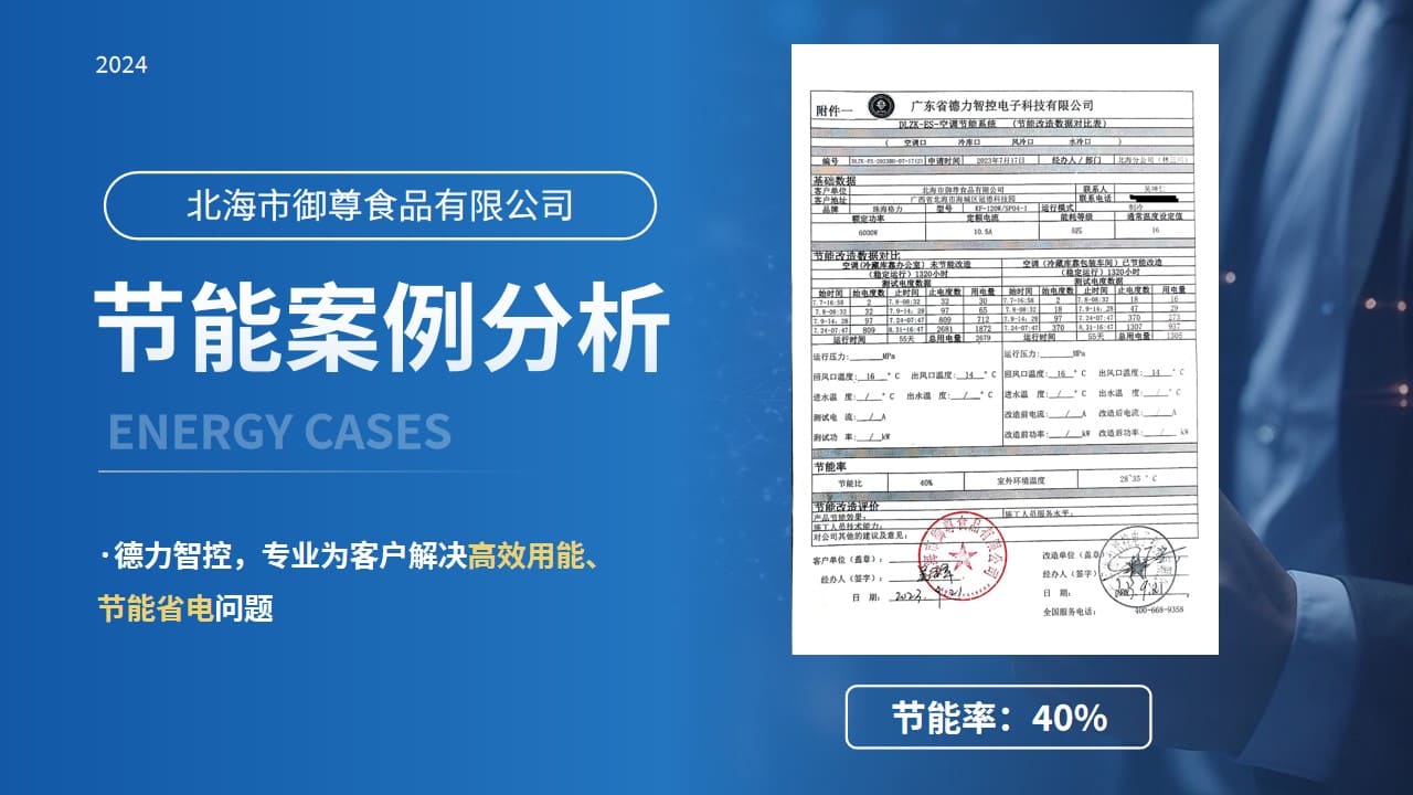 就拿北海市御尊食品有限公司為例,德力智控為該公司的冷庫及空調進行定制化服務,改造后冷庫節能率31%,空調節能率40%,可見,德力智控節能改造服務的省電效果,是真的非常明顯!